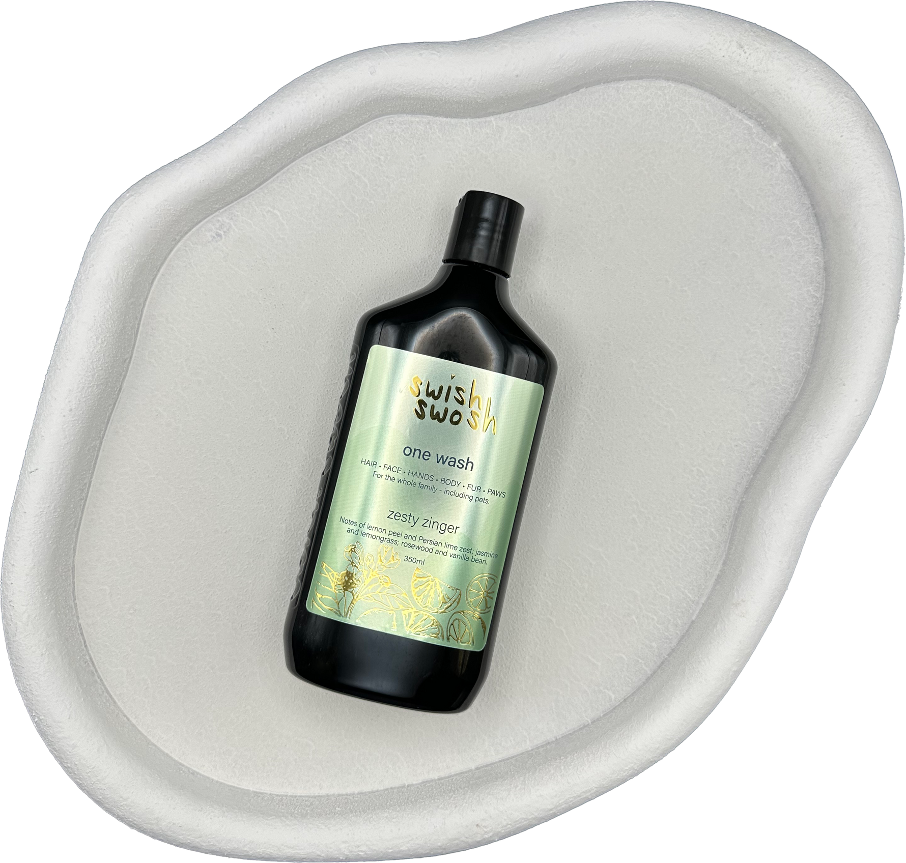 Directions: Lather up using a washcloth or your Swish Swosh Buffing Puff. Apply to wet skin/hair/fur; massage in a circular motion from head to toe. Rinse and gently pat dry with a clean towel. Boost your One Wash with our Swish Swosh Soak & Scrub. Try it without water; apply a small amount directly to dry hands, knees & elbows.